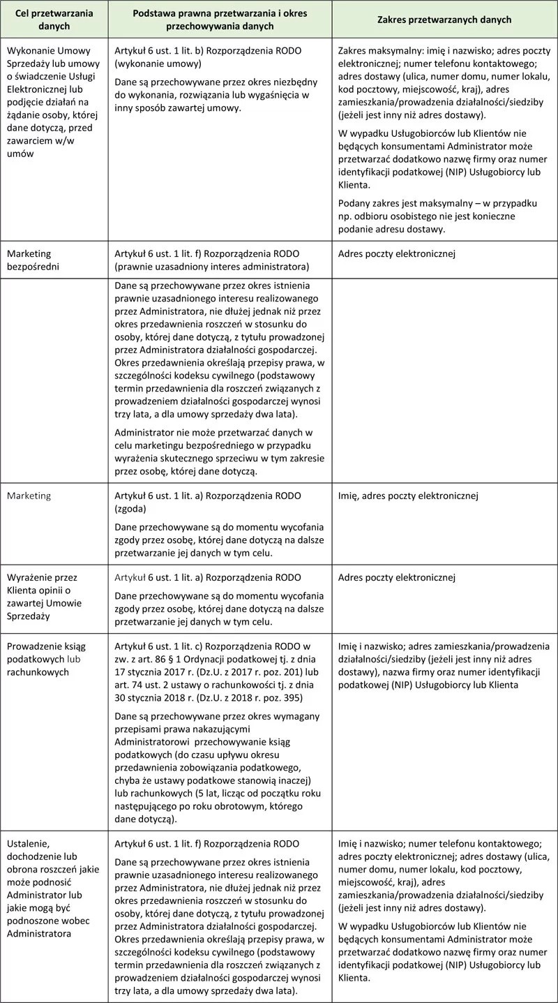 3.1. Każdorazowo cel, podstawa, okres i zakres oraz odbiorcy danych osobowych przetwarzanych przez Administratora wynika z działań podejmowanych przez danego Usługobiorcę lub Klienta w Sklepie Internetowym. Przykładowo jeżeli Klient decyduje się na dokonanie zakupów w Sklepie Internetowym i wybierze odbiór osobisty zakupionego Produktu zamiast przesyłki kurierskiej, to jego dane osobowe będą przetwarzane w celu wykonania zawartej Umowy Sprzedaży, ale nie będą już udostępniane przewoźnikowi realizującemu przesyłki na zlecenie Administratora.